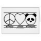 Peace Love and Pandas. A humourous take on the Peace and Love theme for anyone who loves Panda Bears. Simple black and white logos featuring a peace sign, heart and panda bear face on t-shirts, sweatshirts, mugs and more gift and clothing items from T's Me NOW! Customise it!