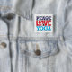 State what's really important to you with this button featuring the words "Peace, Love, and Yoga". The letter "c" in the word peace is substituted with a peace sign, while the heart standing in for the letter "O" in love, contains a silhouette of a woman doing a yoga pose. Available with matching products.