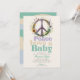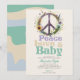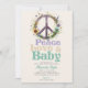 A vintage retro inspired gender neutral baby shower invitation with a "Peace, Love and Baby" theme, featuring an illustration of a hippie peace sign decorated with wildflowers. Perfect for future parents or a mummy who loves the hippie vibe, 70s vibe, boho chic designs and retro vintage designs.