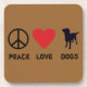 This customisable Peace Love Dogs product design with a peace sign, heart and dog silhouette makes a unique gift for dog owners and lovers.