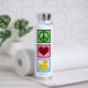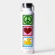 Personalised pretty gift for someone who loves a duck team mascot. A green peace sign, redheart, and a cute yellow rubber ducky. Peace Love Ducks water bottle.