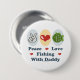 Peace symbol, heart and fish on baby, infant and kids apparel, clothing, stationery and more fishing theme merchandise that make a cute gift for the child of an avid fisherman. An outdoorsman father is sure to love to seeing his son or daughter wearing this cute Peace Love Fishing With Daddy design.
