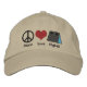Flyball embroidery for dog sports lovers! A peace symbol, red heart, and a blue flyball box make up this Peace, Love, and Flyball hat. Fun to wear around town or to your next competition!