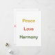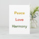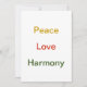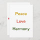 Red, green, and gold. The saying is Peace, Love, Harmony. This is a nice saying for a season's greeting or any time of the year. Bold, bright, and minimalist. The back has Seasons greetings, from name and date. It can be personalised.
