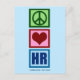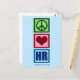 Peace Love HR postcard for a human resources manager. A peace sign, heart, and HR written in blue. Customise with your rep name, business, or company on this cute monogram gift.