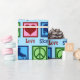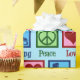 Cute ice skating wrapping paper for a figure skater featuring a peace sign, heart, and ice skates. Pretty PEACE LOVE ICE SKATING in blue.