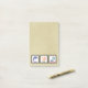 4x6 post-it notes. A cute graphic with 3 squares and inside each square is a separate illustration. A blue dolphin jumping (with decorative designs on his body) with "peace" written below. A cute kawaii style bunny holding a heart shaped lollipop with "Love" written underneath the graphic. And finally a funny unicorn dancing and twirling with glee with the word "insanity" written underneath. Set on a parchment coloured background.