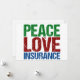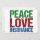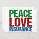A cute insurance agent holiday card featuring green, red, and blue letters that read Peace Love Insurance. Great Christmas cards for your insurance company co-workers.