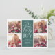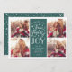 Modern typography based holiday photo card features four of your favourite photos in a square format, with "Peace, Love and Joy" centred in white hand lettered style typography. Personalise with your family name, individual names and/or your custom Christmas message. Cards reverse to a pattern of white snow and stars on a festive spruce green background.