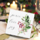 A simple modern double sided holiday card in colours of green and white with a watercolor of a bouquet of holly berries and assorted winter greens and peace love and joy in handwritten script typography. The reverse side has a holiday message and your names which are easily personalised.