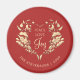 Festive personalised Christmas magnet featuring a rich red background with a golden floral heart wreath and the words Peace, Love, Joy. Customised with your family name and year, this holiday magnet makes a perfect Christmas keepsake, stocking stuffer, or party favour. A stylish way to decorate refrigerators, magnetic boards, or office spaces while coordinating with matching cards, labels, gift tags, and holiday stationery.