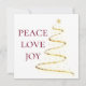 The front features a gold abstract Christmas tree with Peace Love Joy in a traditional deep red