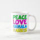 Cute Peace Love Kamala Harris mug for a progressive democrat who loves fun, colourful political designs. Vote for Kamala for president in the 2024 election. A fun liberal design in bright colours.