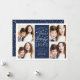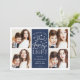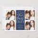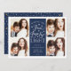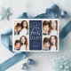 Modern typography based Hanukkah photo card features four of your favourite photos in a square format, with "Peace, Love and Light" centred in white hand lettered style typography. Personalise with your family name, individual names and/or your custom message. Cards reverse to a pattern of white snow and yellow stars on a navy blue background.