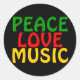 The design says "Peace Love Music" in a full rounded font. "Peace" is in green, "Love" is in red, and "Music" is in gold colour. Great for a musician or music lover.