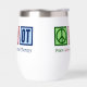 A cute occupational therapist wine tumbler gift featuring a green peace sign, red heart, and OT. Occupational therapy is such an important occupation. It helps both adults and children with sensory therapy.