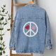 An animal lover's denim jacket, embellished with a white peace sign, a red heart, and a pink paw print.