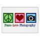Peace Love Photography card for the holidays. A cute peace sign, heart, and camera on a cool photographer company Christmas card.