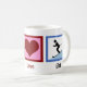 A cute skiing gift for an avid skiier who loves to take to the slopes in winter. A peace sign, heart, and a person on skis coasting down a snowy mountain in pretty blue. A cool ski Christmas present.