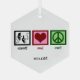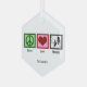 A peace sign, heart, and a happy and sad mask symbolizing acting. A cute gift for an actor in drama club or a theater company. Peace Love Theatre Christmas ornament with your personalized text for a great gift.