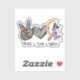 Sleek and playful Halloween sticker featuring the words Peace, Love, Witch paired with a peace-hand sign, a heart icon, and a witch perched on a crescent moon. A clean, symbolic design for lovers of whimsy, witchcraft vibes, and modern spooky style.