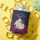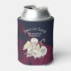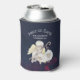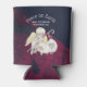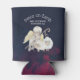 A christian themed can cooler. Designed with a sweet angel with yellow wings holding a shepherds crook. Sitting with white fluffy lambs. Navy blue and burgundy watercolor background, with tiny flecks of faux gold sparkle glitter (not actual glitter just a printed image). Text says: peace on earth and goodwill towards all.