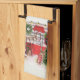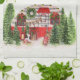 Kitchen towel with a cute and whimsical Christmas theme. A cosy trailer decorated for Christmas set among some pine trees.