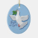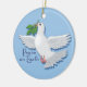 This beautiful Christmas ornament features a white dove of peace holding an olive branch in it‘s mouth on a light blue background with caption “Peace on Earth.”