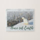 Adorable photo of a white duck along with mallard ducks in the icy water with the quote Peace on Earth in a trendy script font. This puzzle has a soft and wintery snowflake overlay, perfect gift for nature lovers.
