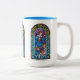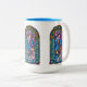 Peace on Earth Pre-Raphaelite style Xmas / New Year ceramic mug. Featuring llustrations in water colour and coloured pencil, of a stained glass design after Burne Jones.