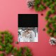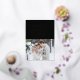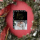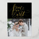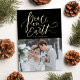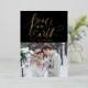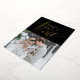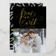 Elegant Christmas card featuring "Peace on Earth" displayed at the top in a hand-lettered gold foil script with your name and photo displayed below on a black background. The back of the gold foil Christmas card features a pattern of white pine branches and dots with a black background (or colour of your choice).