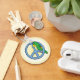 This colourful green parrot cartoon is happily perched inside a big blue peace symbol, which he apparently has been chewing on! Great for avian fans who believe in peace. This cute parrot keychain is perfect for bird lovers.