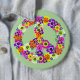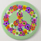 A floral peace sign in shades of pink, yellow, orange, purple, green, white and black.