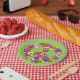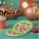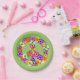 A floral peace sign in shades of pink, yellow, orange, purple, green, white and black graces this festive paper plate.