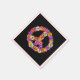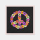 This paper napkin flaunts a floral peace sign shades of pink, turquoise, yellow, orange, purple, green and black.