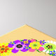 A floral peace sign in shades of pink, yellow, orange, purple, green, white and black.