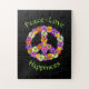 This boho jigsaw puzzle features a floral peace sign in shades of pink, yellow, orange, purple, green, white and black. "Peace, love and happiness" surround the peace sign.