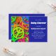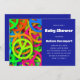 Baby shower invitation with a sixties vibe. Cool peace signs in bright and vibrant neon colours featuring all the colours of the rainbow.