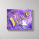 The word "Peace" is painted in a soft golden yellow against a pink and purple background. A dove of peace holds an olive branch in its beak. The watercolor painting has a textural contrast and sparkle from a light layer of glitter.