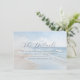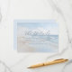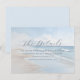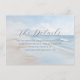 This wedding enclosure card features a serene beach scene with gentle waves and a soft blue sky, creating a tranquil seaside atmosphere. The minimalist design uses calming blues, whites, and light beige tones, enhanced by a dreamy, slightly blurred effect for an ethereal quality. Elegant script typography highlights "The Details," while straightforward sans-serif text provides information about accommodations and directs guests to the wedding website. The layout is balanced and modern, utilising negative space effectively to guide attention smoothly from the title to the details, making it both visually appealing and informative.