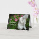 Greeting card with Image of a Buddha statue nestled amongst pink flowers and green foliage. Be Peace, Peace Be saying on front.