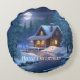 A peaceful scene in a snowy winter forest. A cozy cabin with warm light glowing in its windows, Christmas lights on its porch roof and a wreath on its door sits under a full moon surrounded by tall pine trees.