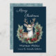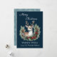 This card features a beautiful deer, with a partial wreath; the wreath is decorated with greenery and holly berries. This design is set against a deep blue backdrop, with light grey text, which can be changed by the customer.