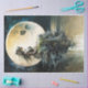 a moon goddess with a full moon behind her over the water