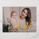 Modern holiday postcard featuring your horizontal photo with "Peaceful" displayed in a hand-lettered gold foil brush script overlay. Personalise the foil holiday postcard by adding your name and the year. The back of the postcard displays your return address and custom message.