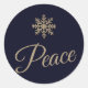 Add a touch of elegance to your holiday mailings and packages with this beautiful round sticker. The deep navy blue background is adorned with a brushed gold snowflake at the top, symbolising the serene beauty of the season. Beneath it, the word "Peace" is delicately scripted in a classic script font, capturing the spirit of tranquillity and goodwill. Perfect for adding a heartfelt touch to your festive greetings, these stickers are a charming way to spread joy and warmth this holiday season. Use them to seal envelopes, decorate gift wrap, or adorn holiday favours. Elevate your holiday presentation with this captivating and meaningful design.