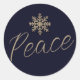 Add a touch of elegance to your holiday mailings and packages with this beautiful round sticker. The deep navy blue background is adorned with a brushed gold snowflake at the top, symbolising the serene beauty of the season. Beneath it, the word "Peace" is delicately scripted in a soft font, capturing the spirit of tranquillity and goodwill. Perfect for adding a heartfelt touch to your festive greetings, these stickers are a charming way to spread joy and warmth this holiday season. Use them to seal envelopes, decorate gift wrap, or adorn holiday favours. Elevate your holiday presentation with this captivating and meaningful design.