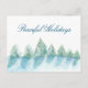 Peaceful Winter Forest Watercolor Script Christmas Holiday Postcard. Watercolor drawing of trees in winter, winter forest with snow in blue and green colours. The design is peaceful and calm with text on the front and inside, in elegant script. Customise the text.