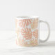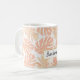 Peach and gold tropical leaves personalised with your name mug. It features leaves of Split Leaf Philodendron (Monstera deliciosa) or Swiss Cheese Plant and palm leaves in green with gold outline . Your name is in a white frame with gold outline.