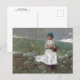A fine art postcard with the painting, Peach Blossoms (1878), by Winslow Homer (1836-1910) an American artist from the realism movement. A young girl sitting on a stone wall near a flowering fruit tree with pink blossoms.